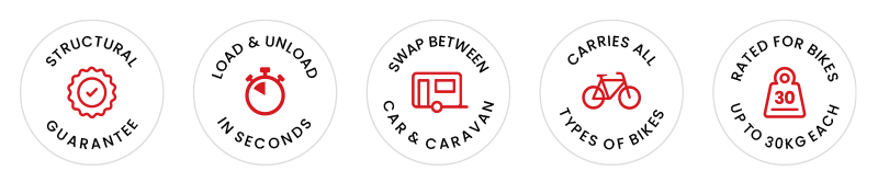 Their caravan carrier systems make travelling easy with the flexibility to carry almost any bike including, road bikes, MTB’s, e-bikes or fat tyre bikes.