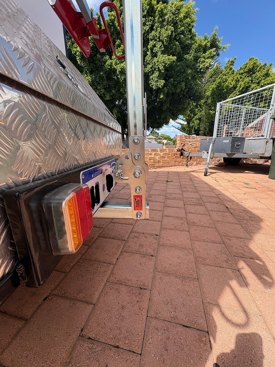Please Note: The price listed is for a 2 bike rack (including light assembly) with our Bush Chook Mid-Post Tilting Mechanism only. A custom mounting assembly (as below) from the 50mm towbar receiver, plus post assembly will need to be custom built to suit each motorhome.